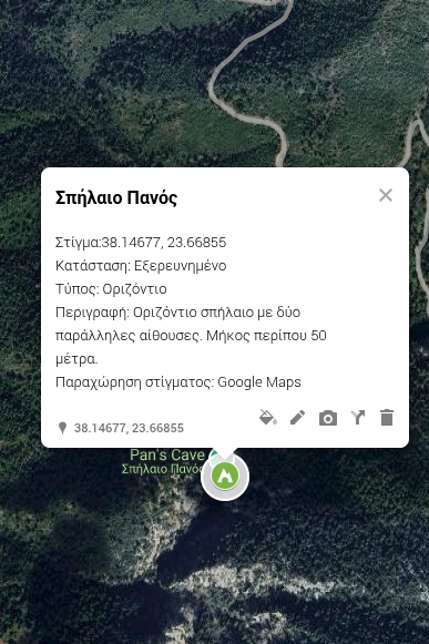 Στον χάρτη εμφανίζονται σπήλαια, διαδρομές (είτε πρόσβαση στη σπηλιά, είτε έρευνα πεδίου), σημεία ενδιαφέροντος (π.χ. κατασκηνώσεις, πάρκινγκ, κ.ά.) και χαρτογραφήσεις.